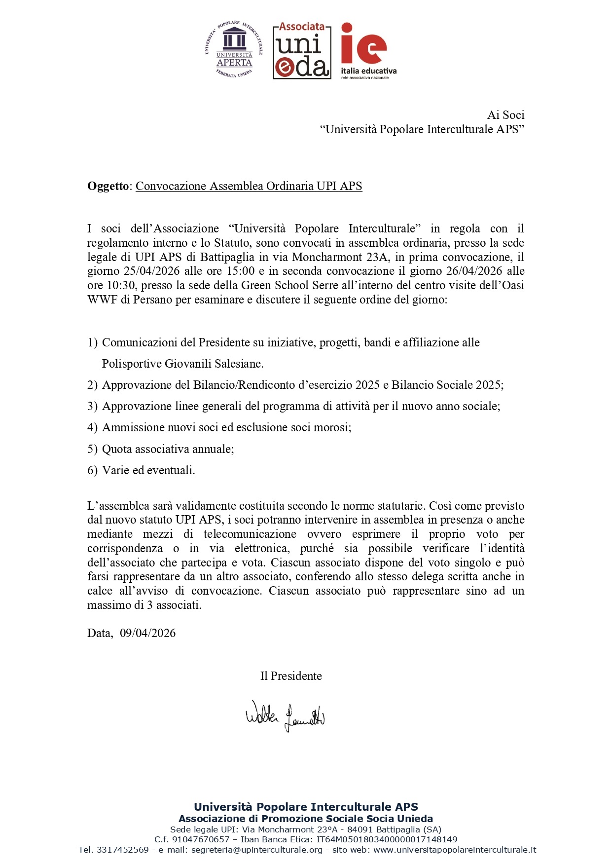 I soci dell’Associazione “Università Popolare Interculturale” in regola con il regolamento interno e lo Statuto, sono convocati in assemblea ordinaria, presso la sede legale di UPI APS di Battipaglia in via Moncharmont 23A, in prima convocazione, il giorno 25/04/2026 alle ore 15:00 e in seconda convocazione il giorno 26/04/2026 alle ore 10:30, presso la sede della Green School Serre all’interno del centro visite dell’Oasi WWF di Persano per esaminare e discutere il seguente ordine del giorno: